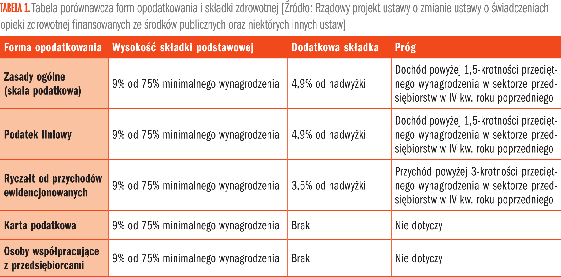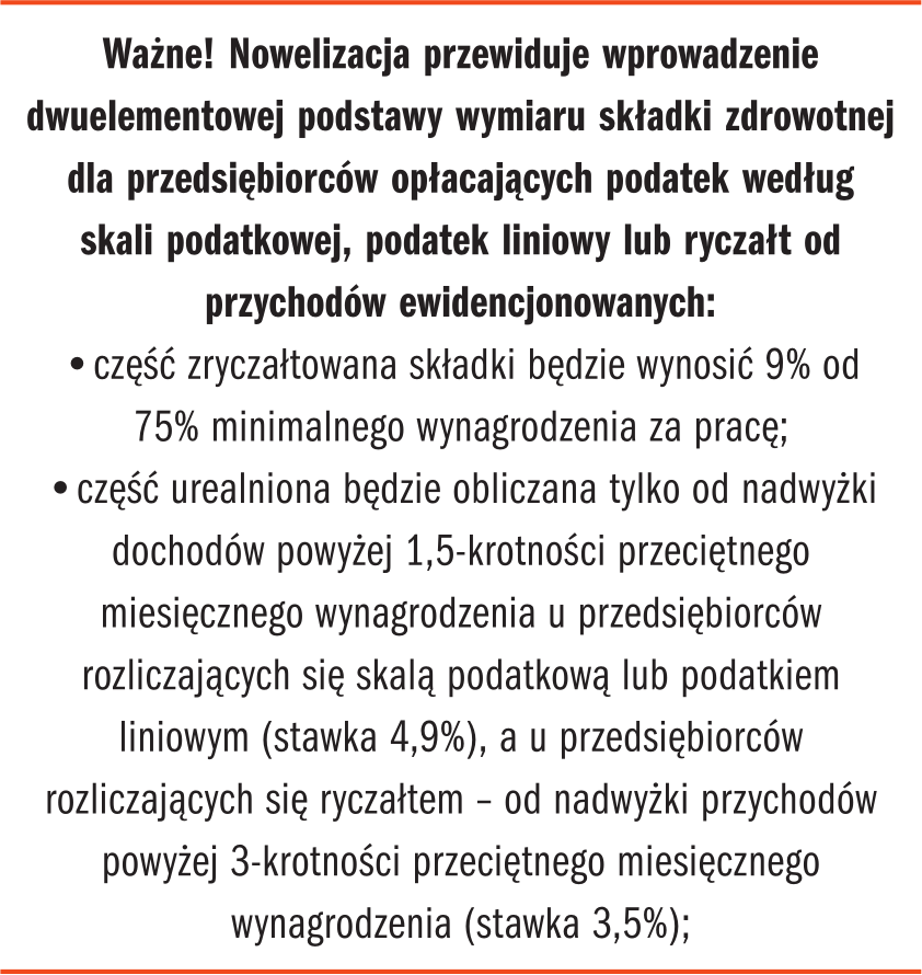 4 kwietnia 2025 r. Sejm przyjął rządowy projekt ustawy zmieniającej zasady rozliczania składki zdrowotnej od 2026 r., który zakłada wprowadzenie dwuelementowej podstawy wymiaru składki zdrowotnej dla przedsiębiorców. Składka zdrowotna do pewnego poziomu będzie ryczałtowa, a od nadwyżki dochodów – procentowa. Część zryczałtowana składki będzie wynosić 9% od 75% minimalnego wynagrodzenia za pracę, natomiast druga ma zależeć od formy opodatkowania przedsiębiorcy. Nowelizacja zakłada również, że od 2026 r. uchylona zostanie możliwość rozliczenia zapłaconych składek zdrowotnych w podatku dochodowym.