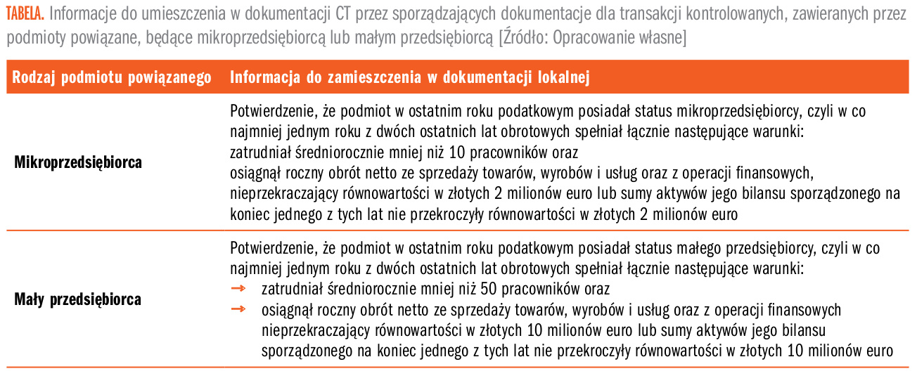 Po nowelizacji dokumentacja określona w pkt. 1 powinna zawierać informację o statusie mikroprzedsiębiorcy lub małego przedsiębiorcy przez wskazanie, czy podmiot powiązany w ostatnim roku podatkowym spełnił warunki do uznania za mikroprzedsiębiorcę lub małego przedsiębiorcę (zob. tabela).