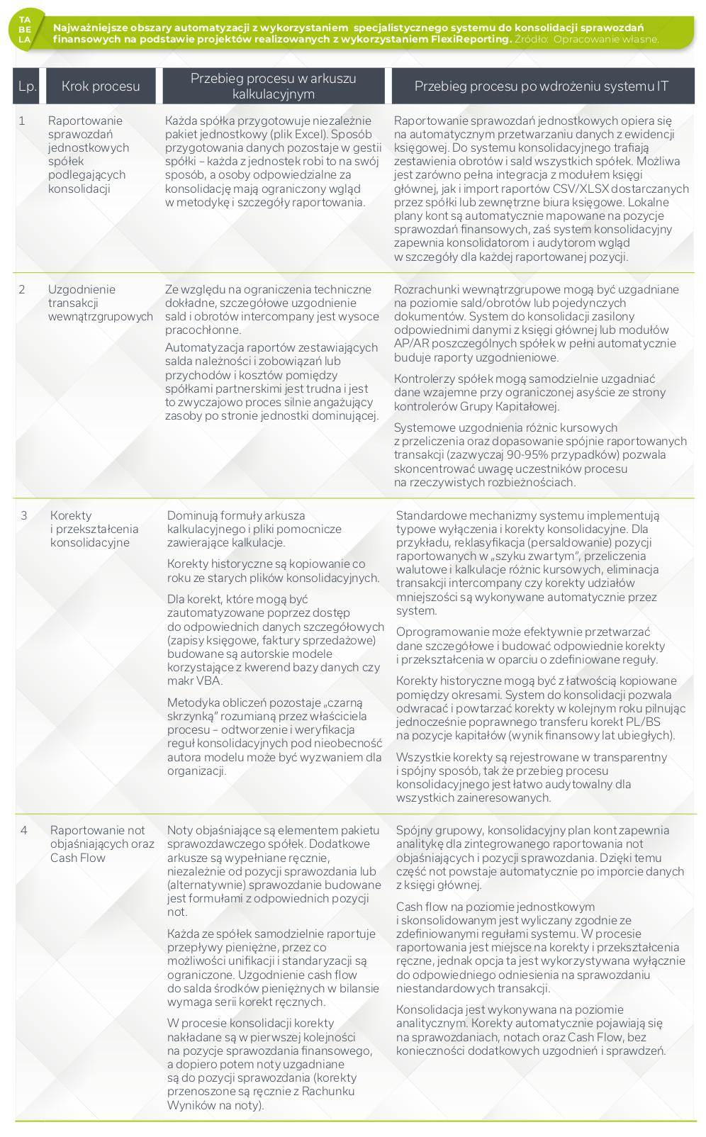 Kluczowe elementy Business Automation wiążą się wprost z kolejnymi krokami procesu konsolidacji. W tabeli zebraliśmy najważniejsze obszary automatyzacji dostępne dzięki wdrożeniu specjalistycznego systemu do konsolidacji sprawozdań finansowych. Prezentujemy w niej możliwości i przykłady usprawnień w przywołanych projektach wdrożenia systemu FlexiReporting.