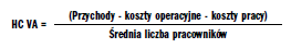 Kolejny wskaźnik to wskaźnik określający, jaką wartość dla firmy dostarczył średnio każdy z funkcjonujących etatów. W literaturze ten wskaźnik jest określany miarą HC VA i oblicza się go ze wzoru: