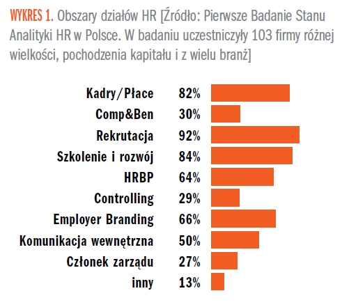 W odpowiedzi na ewolucję biznesu, wiele firm wprowadziło dane od zarządzania procesami, a przy okazji tych zmierzonych procesów, mierzyło pracę ludzi. Niestety, nie była to powszechna praktyka. Warto zwrócić uwagę jak standardowo wyglądają działy HR w firmach operujących w Polsce (wykres 1) pod kątem działających w nich obszarów.