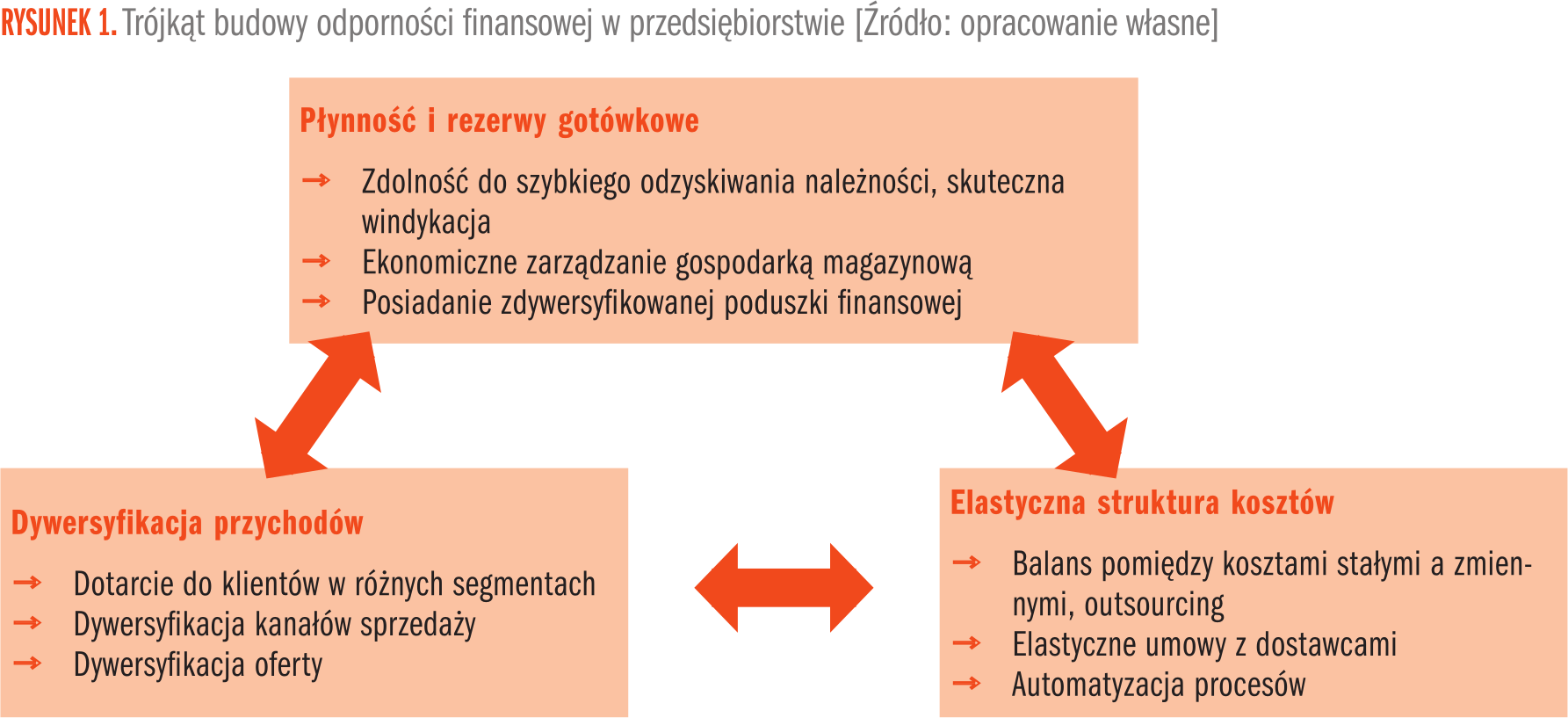 Na Rysunku 1 ujęte zostały trzy filary budowania odporności finansowej, które obejmują: przychody, koszty oraz płynność. Według tej propozycji istotą pozostaje fakt, że odporność tę buduje nie tylko płynność, ale także odpowiednia dbałość o strukturę przychodów i kosztów. Długoterminowo, jeżeli któraś z tych trzech pozycji nie będzie odpowiednio zadbana, istnieje realne ryzyko, że w niesprzyjających okolicznościach przedsiębiorstwo może utracić stabilność finansową. Oczywiście, do pełni zabezpieczenia przydatne jest stałe monitorowanie wypracowywanych wskaźników oraz stałe planowanie scenariuszowe. Odpowiednio zbudowana odporność finansowa pozwala jednostce przetrwać, kiedy jest taka konieczność, ale także zapewnia elastyczność i pozwala na szybkie działanie.