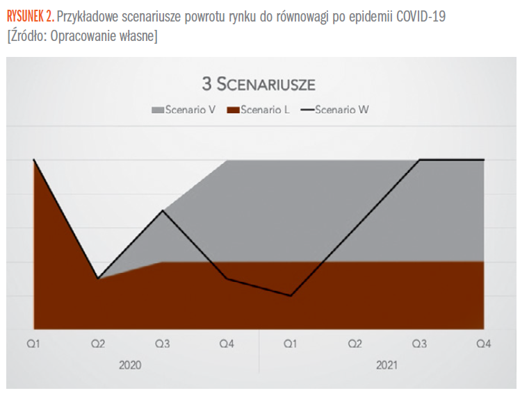 Głównym zagrożeniem w obecnej sytuacji jest niepewność związana z płynnością. Ilość środków oraz dostęp do zasobów jest ograniczony, więc powstaje pytanie, jak długo obecna sytuacja może potrwać. Zupełnie inaczej podejdziemy do problemu, jeśli będziemy widzieć, że powrót do normalności jest tuż za rogiem, a inaczej, jeśli okaże się, że kryzys potrwa rok lub dwa. Inne będą konsekwencje takich scenariuszy. Dlatego proponujemy, aby punktem wyjściowym do rozważania scenariuszy był czas „normalizacji” sytuacji. Przykładowo możemy przyjąć następujące scenariusze (rys. 2):