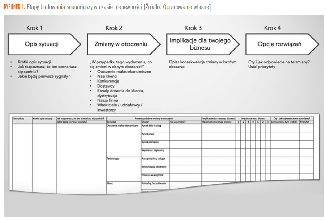 W czasach dużej niepewności musisz ruszyć wyobraźnię i zdefiniować kilka scenariuszy – tak, aby przygotować odpowiedź na potencjalnie nadchodzące wyzwania, jak i nowe możliwości. Można to zrobić w 4 krokach (rys. 1.):
