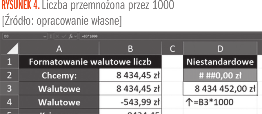 Teraz zwróćmy uwagę na wartość przechowywaną w komórce. Pokazywana jest ona w pasku formuły (Rysunek 1 i 3). Do wartości przechowywanej w komórce nie został dodany symbol waluty, ale widzimy większą precyzję (większą liczbę cyfr) po przecinku, niż jest to pokazywane w arkuszu. Jest to związane z najważniejszą cechą formatowania liczbowego. Nieważne, jaka wartość jest pokazywana w komórce na arkuszu. Excel będzie zawsze wykonywał obliczenia na wartości przechowywanej w komórce tzw. wartości bazowej. W tym przykładzie możemy ją zobaczyć w pasku formuły, ale jeśli byłaby ona wynikiem formuły albo niektórych innych formatowań liczbowych, nie zobaczylibyśmy tej dokładnej wartości. Łatwo jednak możemy pokazać, że Excel faktycznie wykonuje obliczenia na wartości bazowej. Wystarczy, że przemnożymy wartość w komórce B3 przez 1000 (Rysunek 4).
