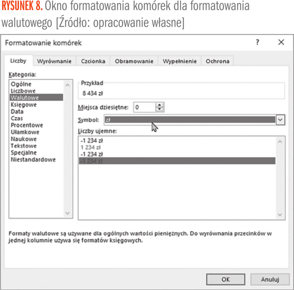 Dla kategorii formatowania liczbowego walutowego możemy wybrać liczbę miejsc dziesiętnych, symbol waluty (jest tu chyba każda waluta istniejąca na świecie, nawet bitcoin) oraz sposób formatowania liczb ujemnych. Aktualnie wybrane, żeby liczby ujemne pokazywały się ze znakiem minus oraz kolorowały na czerwono.