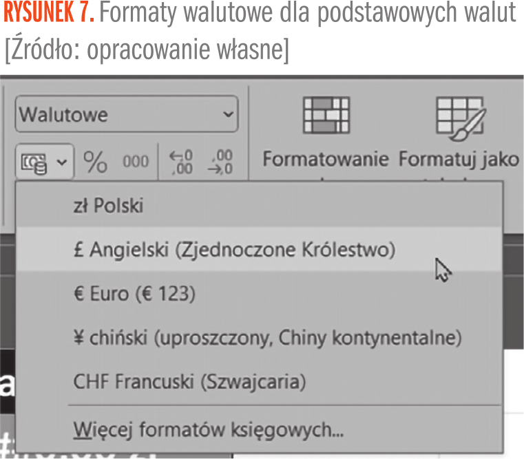 Teraz możemy przejść do zmiany waluty. Podstawowe waluty dla okręgu kulturowego bazującego na ustawienia regionalnych znajdziemy bezpośrednio pod listą rozwijaną z podstawowymi typami formatowania liczbowego (Rysunek 7).