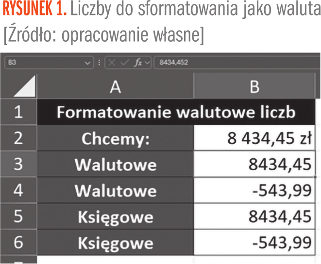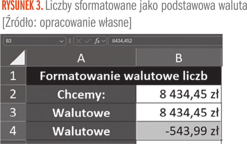 Gdy już sformatowaliśmy komórkę B3 i B4 podstawowym formatowaniem walutowym, możemy zobaczyć (Rysunek 3), że został dodany symbol waluty (zgodnie z ustawieniami regionalnymi Windowsa) oraz również separator tysięcy. Pamiętajmy, że separator tysięcy i dziesiętny są zależne od ustawień regionalnych Windowsa i domyślnie dla różnych krajów mogą się różnić. Przykładowo dla Polski, Francji, Niemiec czy Włoch będą to odpowiednio spacja i przecinek, a dla Stanów Zjednoczonych, Kanady, Wielkiej Brytanii czy Australii – przecinek i kropka.