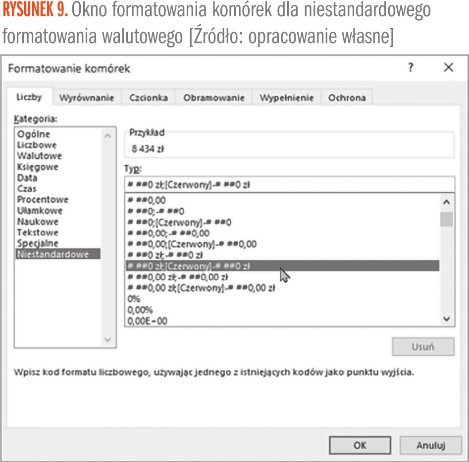 Jeśli formaty w danej kategorii nie zapewniają nam wystarczającej kontroli nad sposobem pokazywania liczby, możemy przejść na kategorię Niestandardowe (Rysunek 9).