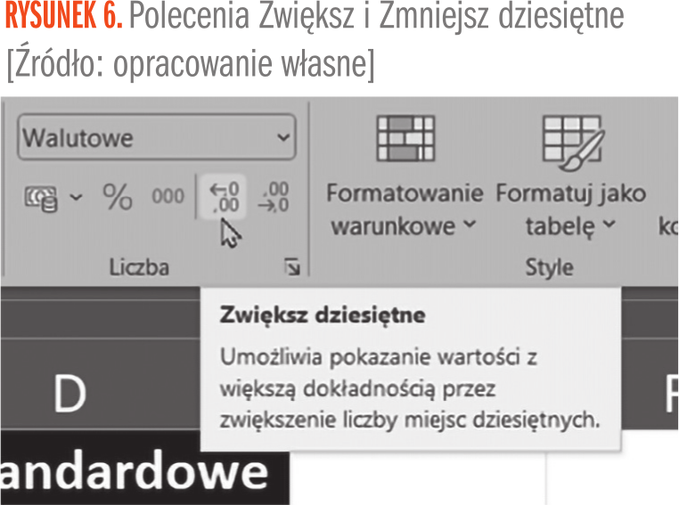 Kolejną ważną rzeczą, na którą musimy zwrócić uwagę przy formatowaniu liczbowym, są wizualne zaokrąglenia. Możemy przykładowo skorzystać z poleceń Zwiększ dziesiętne i Zmniejsz dziesiętne na karcie Narzędzia główne (Rysunek 6), by zmienić liczbę cyfr po przecinku.