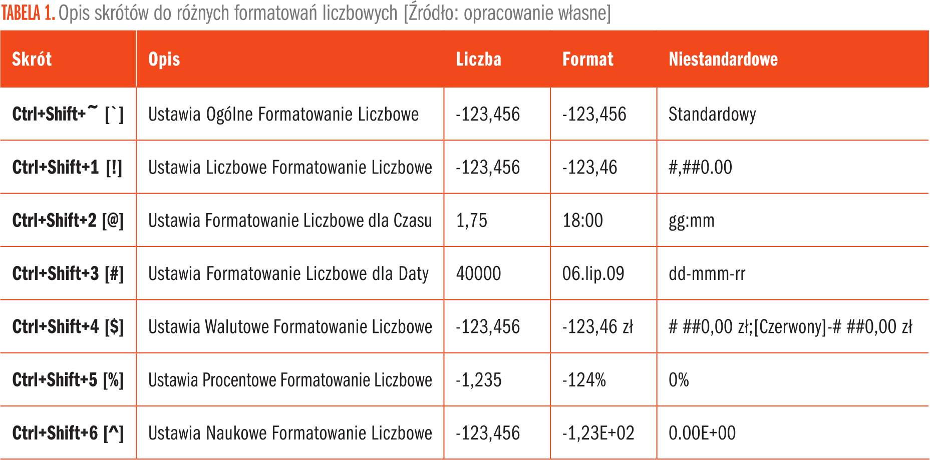 Nie tylko do formatowania walutowego istnieje skrót klawiszowy. Poszczególne skróty zostały opisane w Tabeli 1.