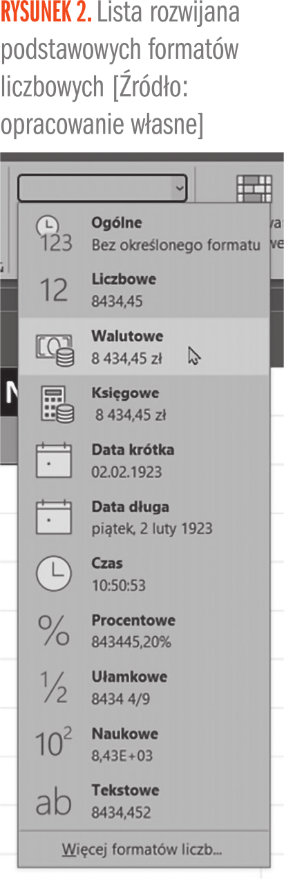 Żeby nałożyć podstawowe formatowanie tego typu, można zaznaczyć komórki, na które chcemy nałożyć konkretne formatowanie liczbowe, a następnie rozwinąć listę rozwijaną na karcie Narzędzia główne (Rysunek 2). Na razie chcemy sformatować tylko B3 i B4 jako podstawowe formatowanie walutowe. Excel na tej liście podpowiada nam, jak będzie pokazywana liczba dla poszczególnych podstawowych formatów liczbowych. Widzimy, że liczba może być sformatowana jako data i czas, ale na razie skupmy się na formatach związanych z walutami.