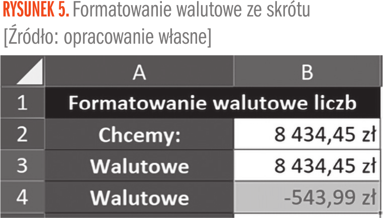 Omawiając dalej formatowanie walutowe, warto zwrócić uwagę, że istnieje skrót klawiszowy (Ctrl + Shift + 4), który pozwoli nam szybko nałożyć formatowanie walutowe na zaznaczone komórki. Ten skrót klawiszowy nakłada jednak trochę inne formatowanie walutowe niż zastosowane przez nas podstawowe formatowanie. Dodaje on warunek, że liczby ujemne mają być pokazywane na czerwono (Rysunek 5).