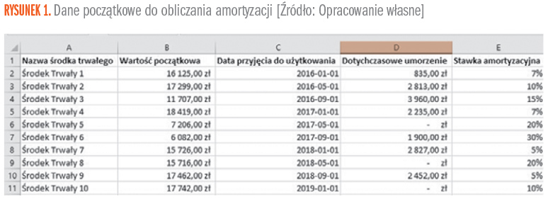 Aby móc obliczyć w Excelu odpis amortyzacyjny, potrzebujemy mieć zgromadzone następujące informacje: wartość początkową środka trwałego, datę przyjęcia do użytkowania, dotychczasowe umorzenie oraz stawkę amortyzacyjną. Przykład takich danych pokazuje Rysunek 1.