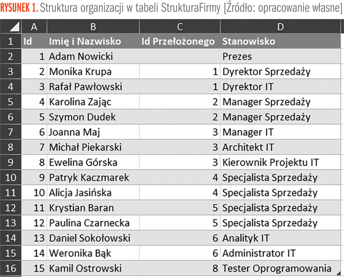 W tym artykule rozważymy strukturę organizacji (Rysunek 1), która zawiera osoby z różnych działów i na różnych stanowiskach. Wyznaczymy poziom w hierarchii pracownika z pomocą Power Query i stworzonej przez nas funkcji rekurencyjnej (funkcji, która będzie uruchamiać samą siebie).