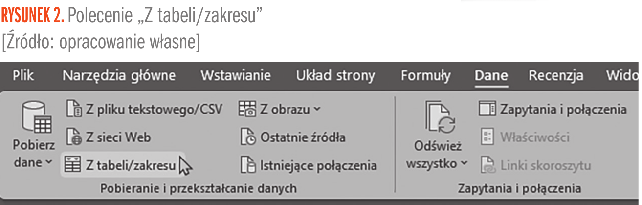 Żeby załadować dane z tabeli Excela do Edytora Power Query, zaznaczamy w niej pojedynczą komórkę, a następnie na karcie Dane klikamy w polecenie „Z tabeli/zakresu” (Rysunek 2).