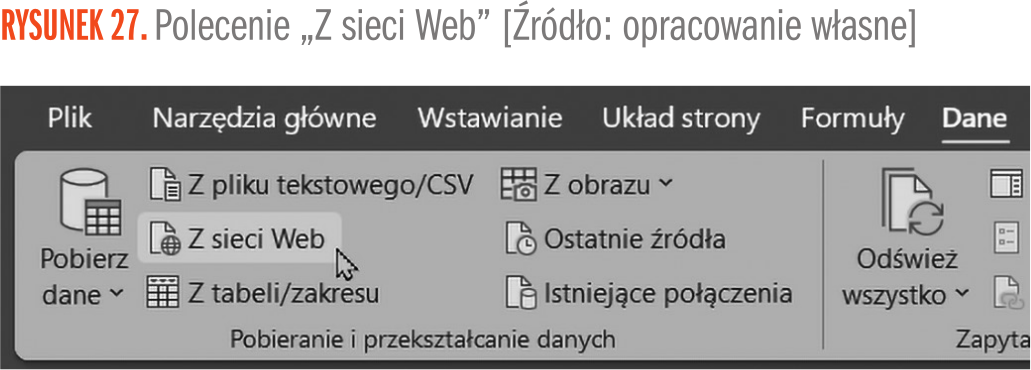 Przekształcenia w tym przykładzie zaczynamy od zaimportowania danych z pojedynczej strony www, czyli na karcie „Dane” klikamy w polecenie „Z sieci Web”, jak pokazuje to Rysunek 27.