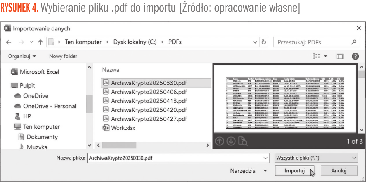 Otworzy to okno „Importowanie danych”, w którym musimy odnaleźć plik .pdf, z którego chcemy pobrać dane. Po jego zaznaczeniu klikamy w przycisk „Importuj”, jak pokazuje to Rysunek 4.