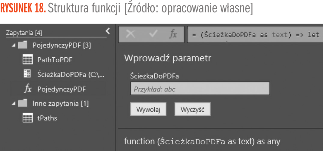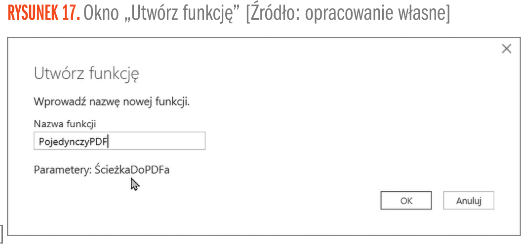 Otworzy to okno „Utwórz funkcję”, gdzie w pole „Nazwa funkcji” wpisujemy nazwę funkcji. Powinna ona mieć inną nazwę niż wcześniej utworzony parametr i zapytania. Niech będzie to PojedynczyPDF, jak pokazuje to Rysunek 17.