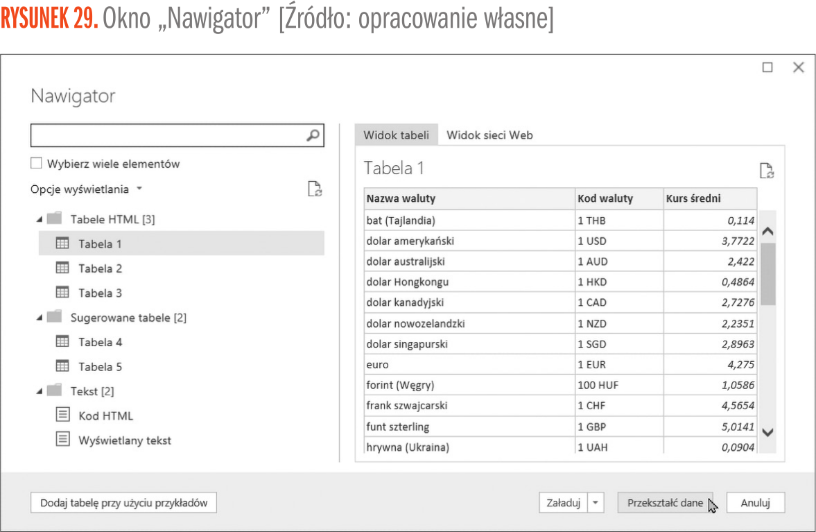 Potwierdzenie adresu www wykonujemy, klikając w przycisk „OK”. Otworzy to okno nawigatora, gdzie będziemy mogli wybrać, skąd dokładnie chcemy pobrać dane ze wskazanej strony. Przeważnie są to różne tabele, ale od pewnego czasu jest dostępna również możliwość pobrania całego kodu HTML albo wyświetlanego tekstu. Jednak te dwie opcje wymagają dużo więcej oczyszczania danych. W tym przykładzie wystarczy, że pobierzemy dane z Tabeli 1. Są tam wszystkie informacje, jakich potrzebujemy. Wystarczy zaznaczyć tę tabelę, a następnie kliknąć w przycisk „Przekształć dane”, jak pokazuje to Rysunek 29.