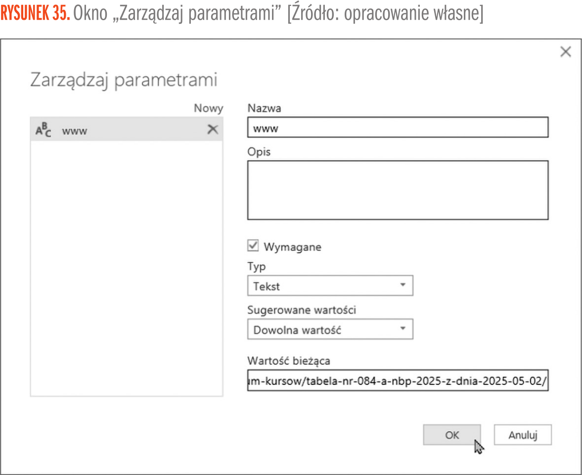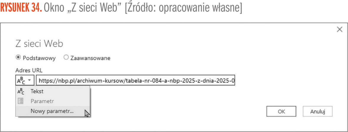 Teraz możemy przejść do parametryzacji zapytania analogicznie jak w poprzednim przykładzie, czyli w pierwszej kolejności klikamy w koło zębate obok kroku „Źródło”. Otworzy to okno „Z sieci Web”, gdzie kopiujemy adres strony z pola „Adres URL”, a następnie na liście rozwijanej obok wybieramy „Nowy parametr”, jak pokazuje to Rysunek 34.