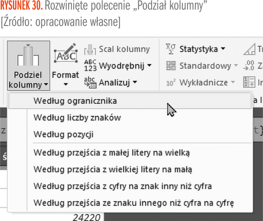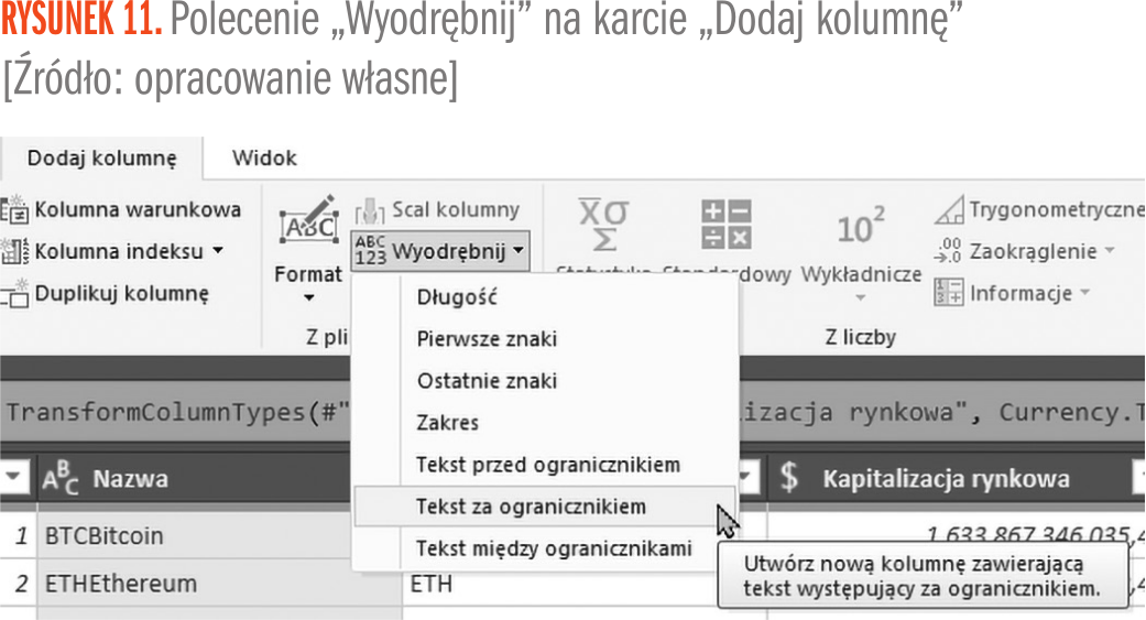 Dlatego w tym przykładzie na karcie „Dodaj kolumnę” rozwiniemy polecenie „Wyodrębnij” i skorzystamy z opcji „Tekst za ogranicznikiem”, jak pokazuje to Rysunek 11.