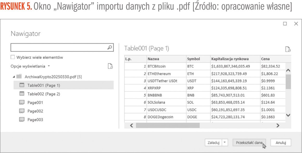 Standardowo możemy pobrać informację z jednej strony lub tabeli. Ważne, że pojedyncza tabela może zająć maksymalnie jedną stronę. Klikając na ikonę foldery/nazwę pliku w oknie „Nawigator” (Rysunek 5), pobierzemy wszystkie dane z pliku .pdf, które później będziemy mogli odfiltrować.