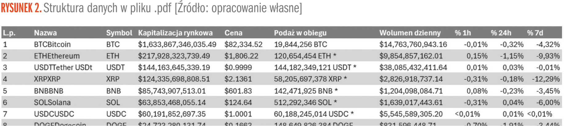 W pierwszej kolejności pobierzemy dane z jednego pliku. Strukturę danych w przykładowym pliku .pdf pokazuje Rysunek 2.
