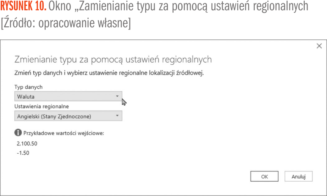 Otworzy to okno „Zmienianie typu za pomocą ustawień regionalnych”, gdzie jako „Typ danych” potrzebujemy wybrać walutę, a jako „Ustawienia regionalne” Angielski (Stany Zjednoczone), jak pokazuje to Rysunek 10.