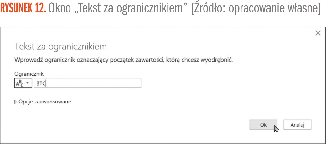 Otworzy to okno „Tekst za ogranicznikiem”, w którym wystarczy w pole „Ogranicznik” wpisać przykładową wartość tekstową, np. BTC, jak pokazuje to Rysunek 12.