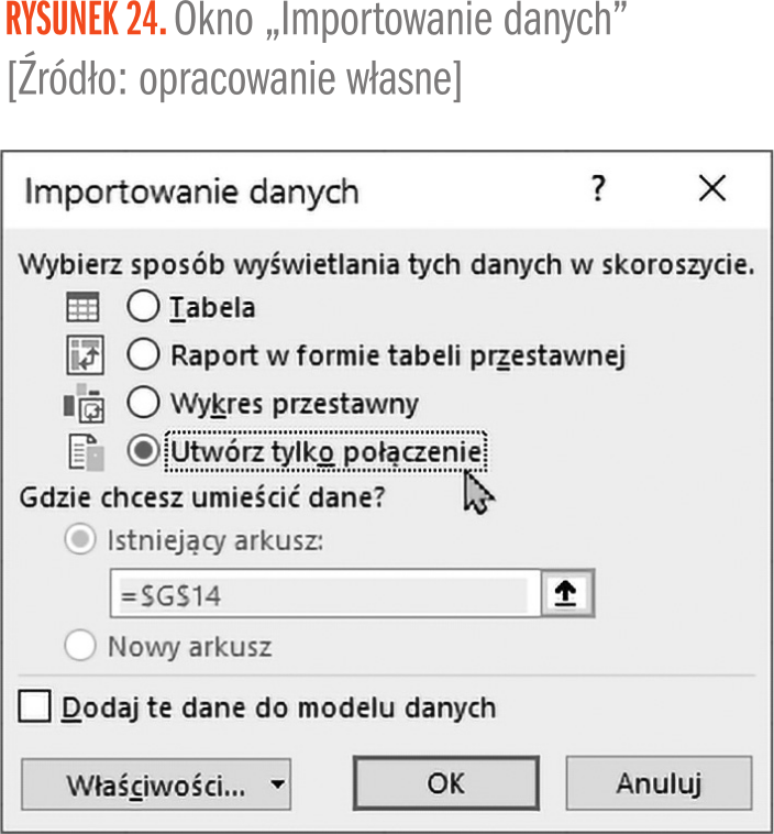 - W oknie „Importowanie danych” wybieramy opcję „Utwórz tylko połączenie” (Rysunek 24). Opcja ta dotyczy tylko utworzonego przez nas zapytania „PojedynczyDzień”. Ponieważ zapytanie „KursyWedługDaty” zostało wcześniej zaimportowane do Excela, teraz powinno się automatycznie odświeżyć (należy pamiętać, że pobieranie danych ze stron internetowych może zająć więcej czasu).