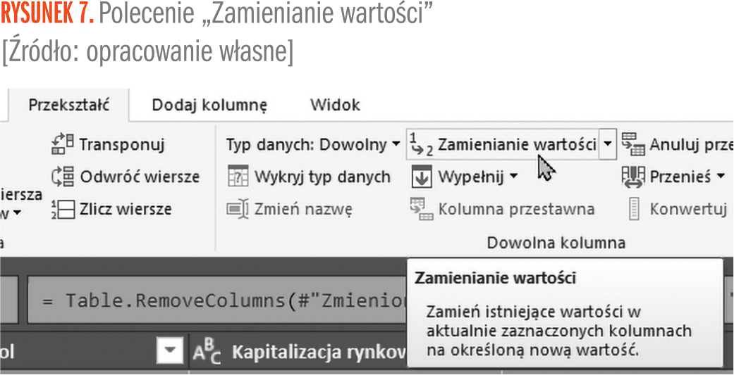 Na koniec dokonamy najtrudniejszego przekształcenia, czyli poprawimy dane w kolumnie „Nazwa”. Możemy zauważyć (Rysunek 5), że w kolumnie „Nazwa” przed każdą nazwą kryptowaluty znajduje się jej symbol. Żeby poprawić kolumnę „Nazwa”, nie możemy po prostu użyć polecenia „Zamienianie wartości” z karty Przekształć (Rysunek 7), ponieważ użyta w nim funkcja nie pozwala dopasować wartości dla poszczególnych wierszy. Dla całej kolumny musimy użyć tej samej wartości.