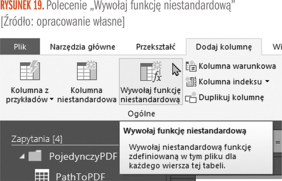 Teraz możemy wykorzystać stworzoną przez nas funkcję w zapytaniu „Paths”. Wystarczy do niego przejść, a następnie na karcie „Dodaj Kolumnę” kliknąć w polecenie „Wywołaj funkcję niestandardową”, jak pokazuje to Rysunek 19.