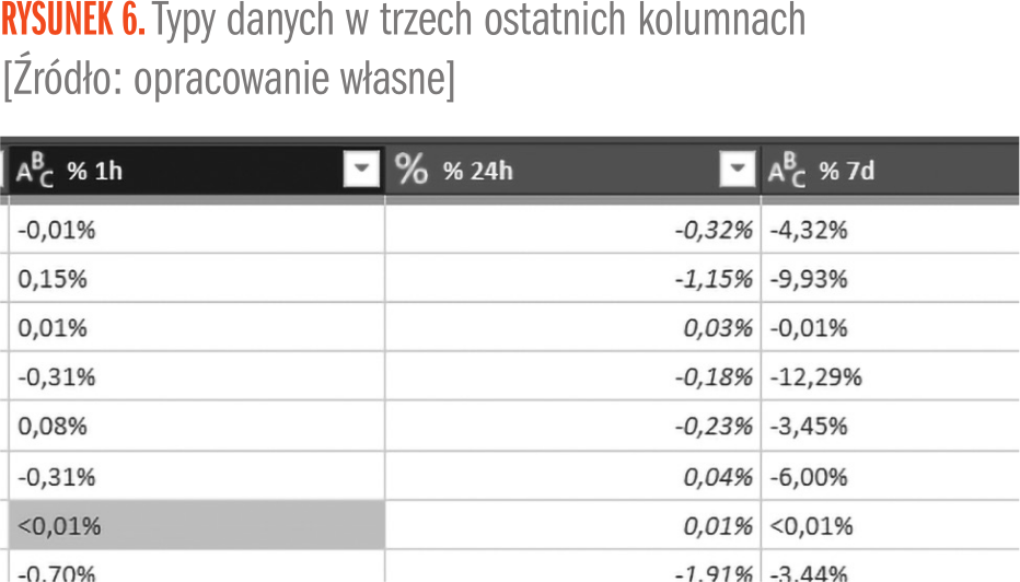 Pierwszym przekształceniem jest poprawienie danych w trzech ostatnich kolumnach (% 1h, % 24h, % 7d). Możemy zauważyć, że edytor od początku wszystkim kolumnom przypisał tekstowy typ danych. W niektórych komórkach występuje znak mniejszości (co pokazuje Rysunek 6), na początku nam to odpowiada.