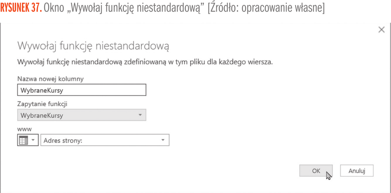 Możemy teraz przejść do zapytania „KursyWedługDaty” i kliknąć w polecenie „Wywołaj funkcję niestandardową” na karcie „Dodaj kolumnę” (Rysunek 19). Okno „Wywołaj funkcję niestandardową” wypełniamy zgodnie z Rysunkiem 37.
