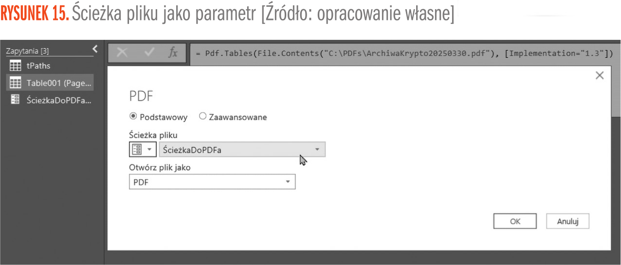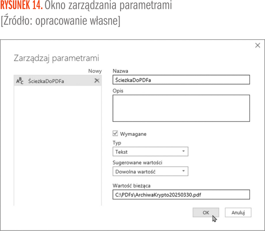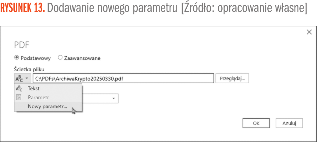Jeśli ten checkbox jest zaznaczony, możemy kliknąć w koło zębate obok nazwy kroku „Źródło”. W tym przykładzie otworzy to okno importu danych z pliku .pdf, gdzie możemy rozwinąć listę obok pola „Ścieżka pliku” i wybrać tutaj opcję „Nowy parametr”, jak pokazuje Rysunek 13.