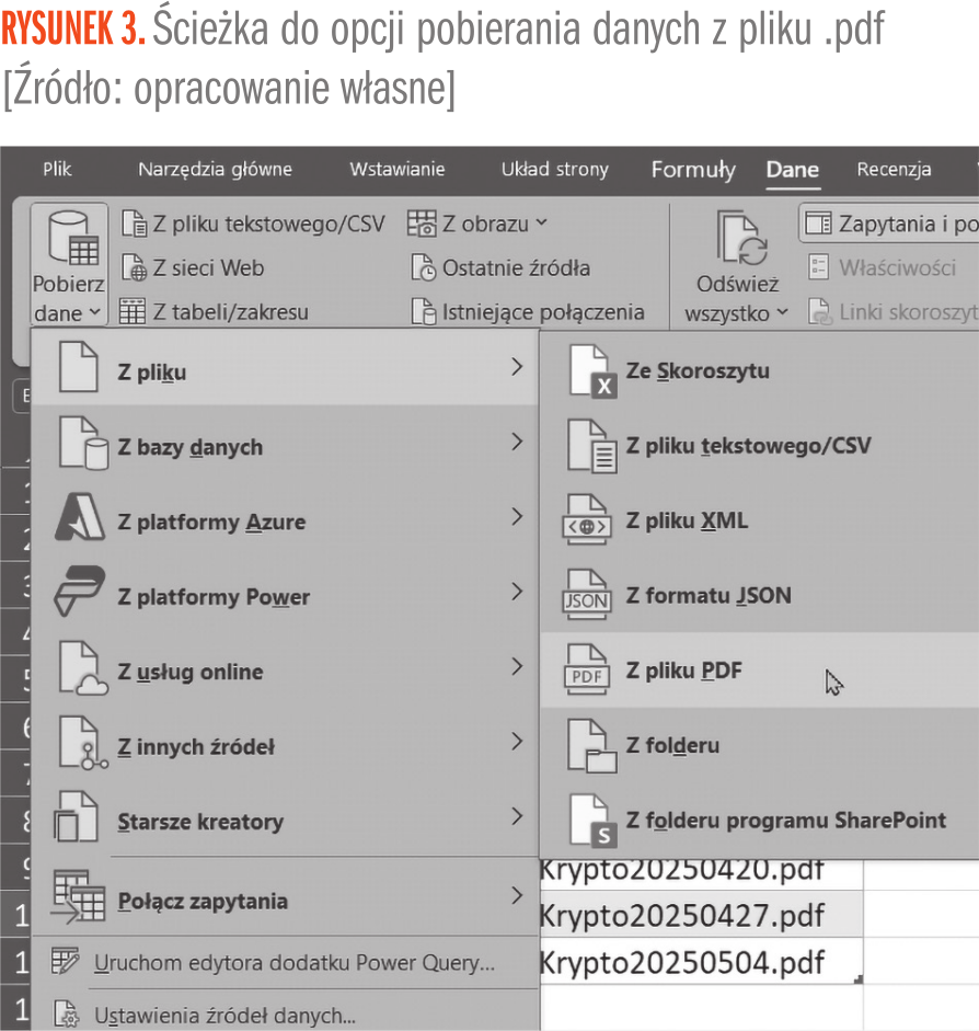 Żeby pobrać dane z pliku .pdf do Power Query, należy na karcie „Dane” rozwinąć polecenie „Pobierz dane”, następnie przejść do opcji „Z pliku” i wybrać pozycję „Z pliku PDF”, co pokazuje Rysunek 3.