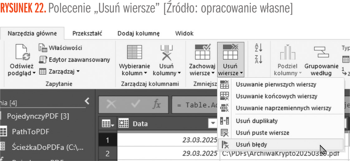 Dla wierszy, gdzie wskazany plik nie istnieje funkcja, w kolumnie „PojedynczyPDF”, zwraca błąd (Error), a dla prawidłowych ścieżek zwraca tabele. Zanim rozwiniemy tabele, musimy usunąć wiersze z błędami. Wystarczy, że zaznaczymy kolumnę „PojedynczyPDF”, a następnie na karcie „Narzędzia główne” rozwiniemy polecenie „Usuń wiersze” i wybierzemy opcję „Usuń błędy”, jak pokazuje to Rysunek 22.