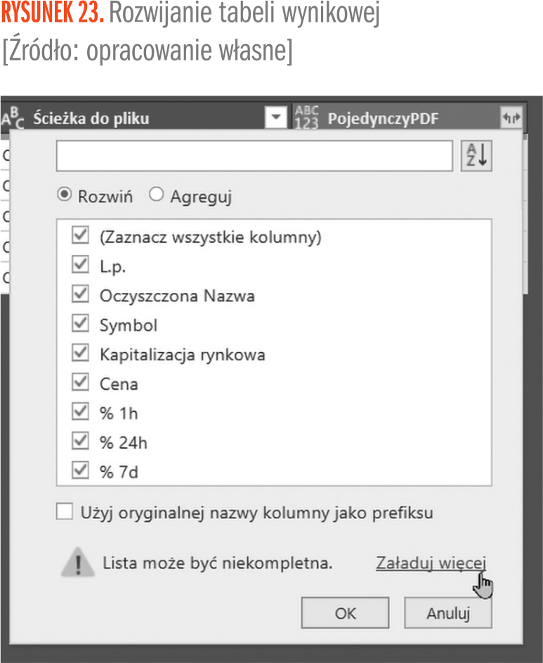 Po usunięciu wierszy z błędami możemy kliknąć w ikonę dwóch strzałek w nagłówku kolumny „PojedynczyPDF” i wybrać, które kolumny z wyniku chcemy rozwinąć. My zakładamy, że chcemy wszystkie kolumny, ale bez prefiksów, dlatego odznaczamy checkbox „Użyj oryginalnej nazwy kolumny jako prefiksu”, jak pokazuje to Rysunek 23. Przy rozwijaniu większych tabel może być potrzeba kliknięcia w link „Załaduj więcej danych”, żeby edytor na pewno uwzględnił wszystkie kolumny wewnętrznej tabeli. W tym przykładzie nie ma takiej potrzeby.
