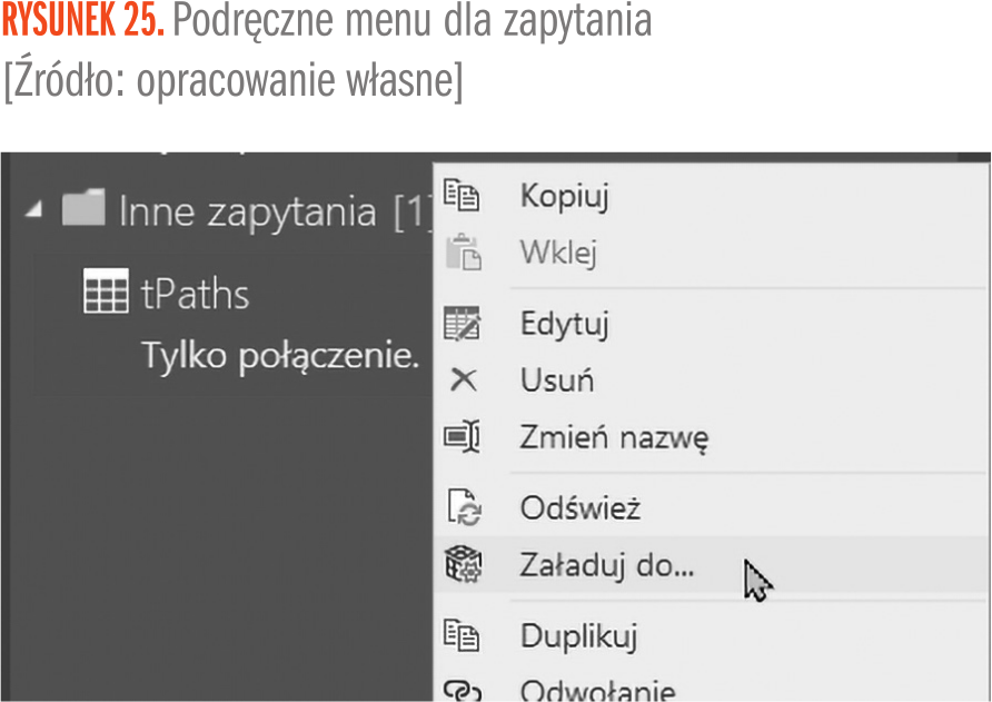 Nam zależy na tym, żeby do Excela zaimportować wynik zapytania „tPaths”, gdzie połączyliśmy informacje z kilku plików. Żeby zmienić miejsce importowania zapytania, trzeba na nie kliknąć prawym przyciskiem myszy w oknie „Zapytania i połączenia” i w podręcznym menu wybrać opcję „Załaduj do”, jak pokazuje to Rysunek 25.