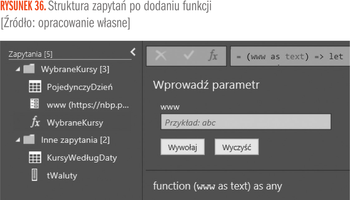 Teraz analogicznie jak w poprzednim przykładzie (Rysunek 16) zamieniamy zapytanie „PojedynczyDzień” na funkcję. Nowej funkcji nadajemy nazwę „WybraneKursy” (analogicznie jak Rysunek 17). Uzyskamy w ten sposób podobną strukturę jak w poprzednim przykładzie. Pokazuje ją Rysunek 36.