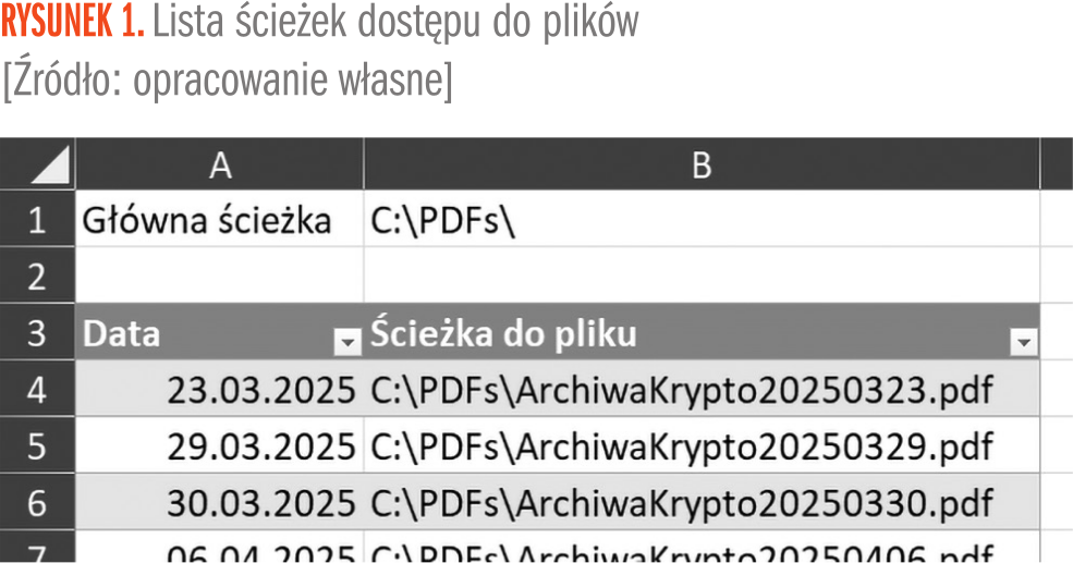Pierwszy omawiany przykład będzie dotyczył pobierania danych z plików .pdf. Mamy przygotowaną tabelę, zaciągniętą do Power Query, w której mamy listę przykładowych ścieżek dostępu do plików, które pokazuje Rysunek 1.