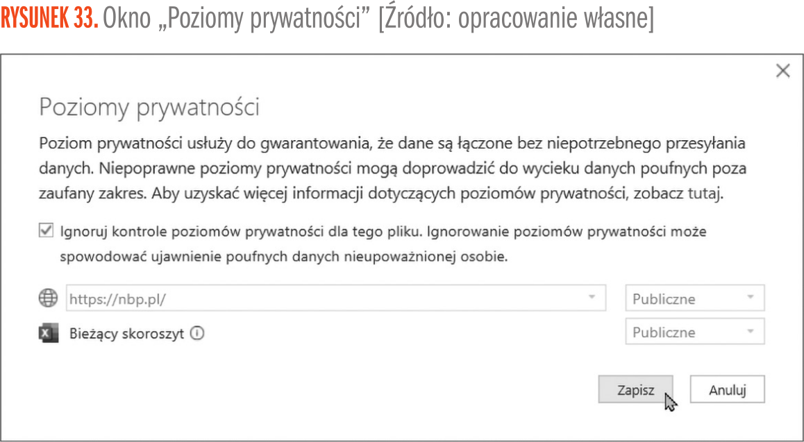 Przy pobieraniu danych z sieci może się pojawić dodatkowe okno uwierzytelnienia. W tym przykładzie wystarczy nam uwierzytelnienie anonimowe, ponieważ nie ma potrzeby do logowania się do strony NBP.