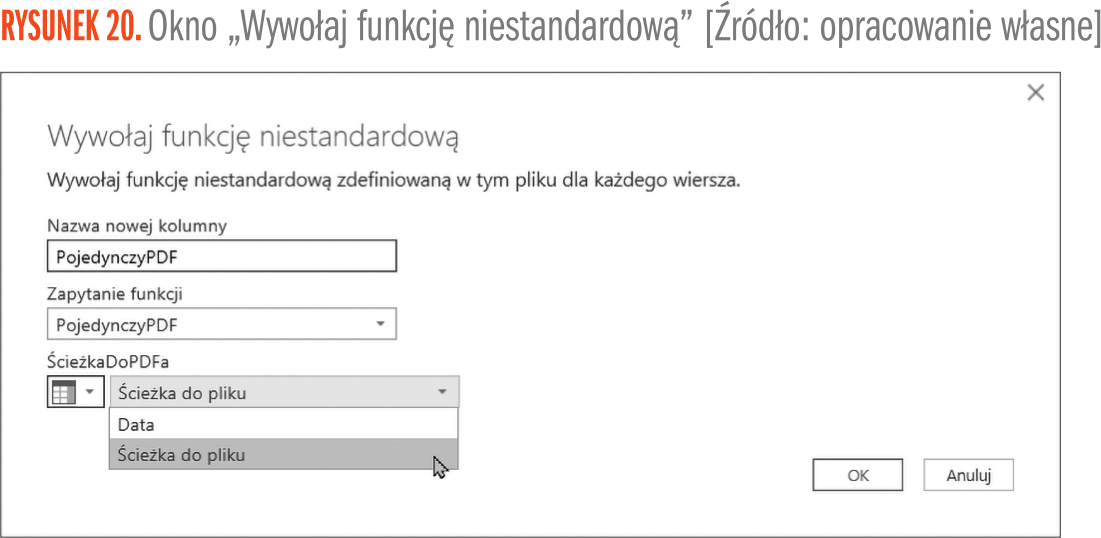 Otworzy to okno „Wywołaj funkcję niestandardową”, w który musimy wybrać funkcję, której chcemy użyć (pole „Zapytanie funkcji”). Na podstawie wybranej nazwy funkcji powinno domyślnie wypełnić się pole „Nazwa nowej kolumny”. Pozostaje jeszcze upewnić się, że parametr ŚcieżkaDoPDFa, czyli argument funkcji, prawidłowo odwołuje się do kolumny „Ścieżka do pliku”, jak pokazuje to Rysunek 20.