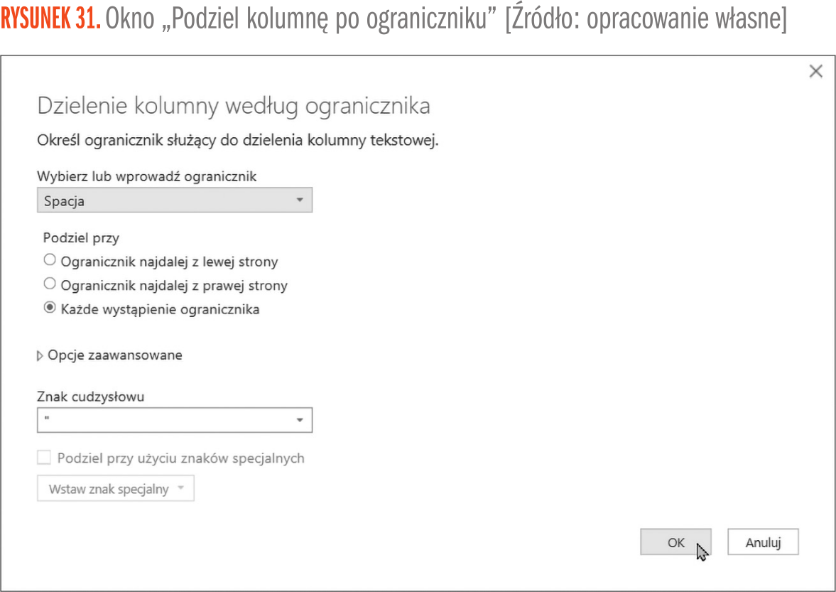 Otworzy to okno „Podziel kolumnę po ograniczniku”, gdzie automatycznie powinna zostać wybrana spacja jako ogranicznik. Ponieważ w kolumnie „Kod waluty” występuje zawsze tylko pojedyncza spacja, nie musimy zmieniać również żadnych innych opcji, czyli okno „Podziel kolumnę po ograniczniku” powinno wyglądać tak, jak pokazuje to Rysunek 31.