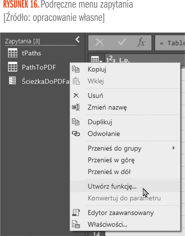 Po zmianie nazwy zapytania możemy w nią kliknąć na liście zapytań prawym przyciskiem myszy i w podręcznym menu wybrać opcję „Utwórz funkcję”, jak pokazane jest to na Rysunku 16.