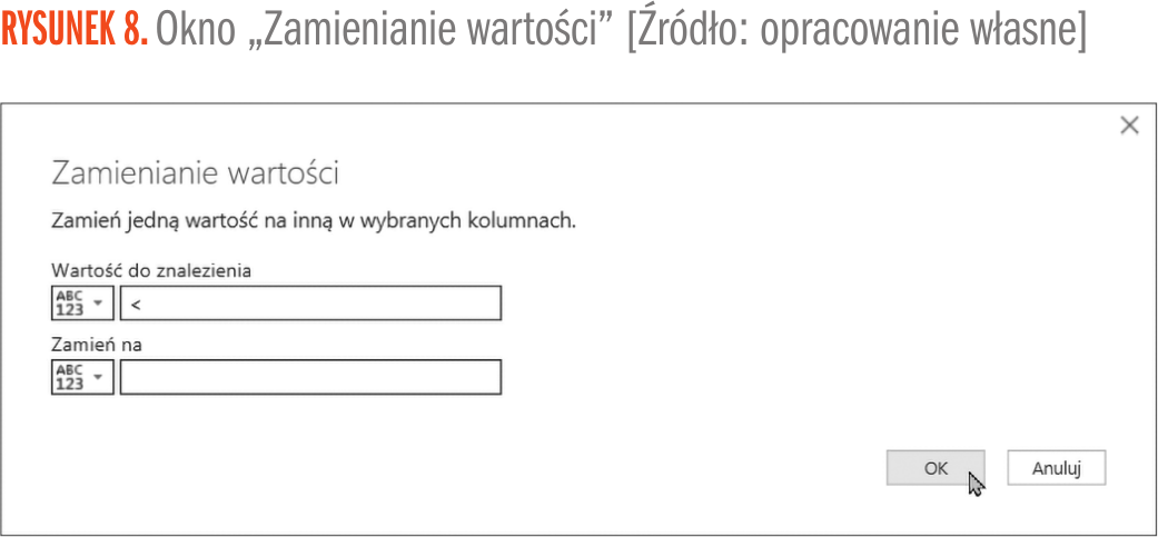 Otworzy to okno „Zamienianie wartości”, gdzie w pole „Wartość do znalezienia” wstawiamy znak mniejszości, a pole „Zamień na” pozostawiamy puste, jak pokazuje to Rysunek 8. Wprowadzone przez nas zmiany zatwierdzamy przyciskiem OK.