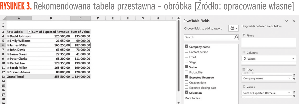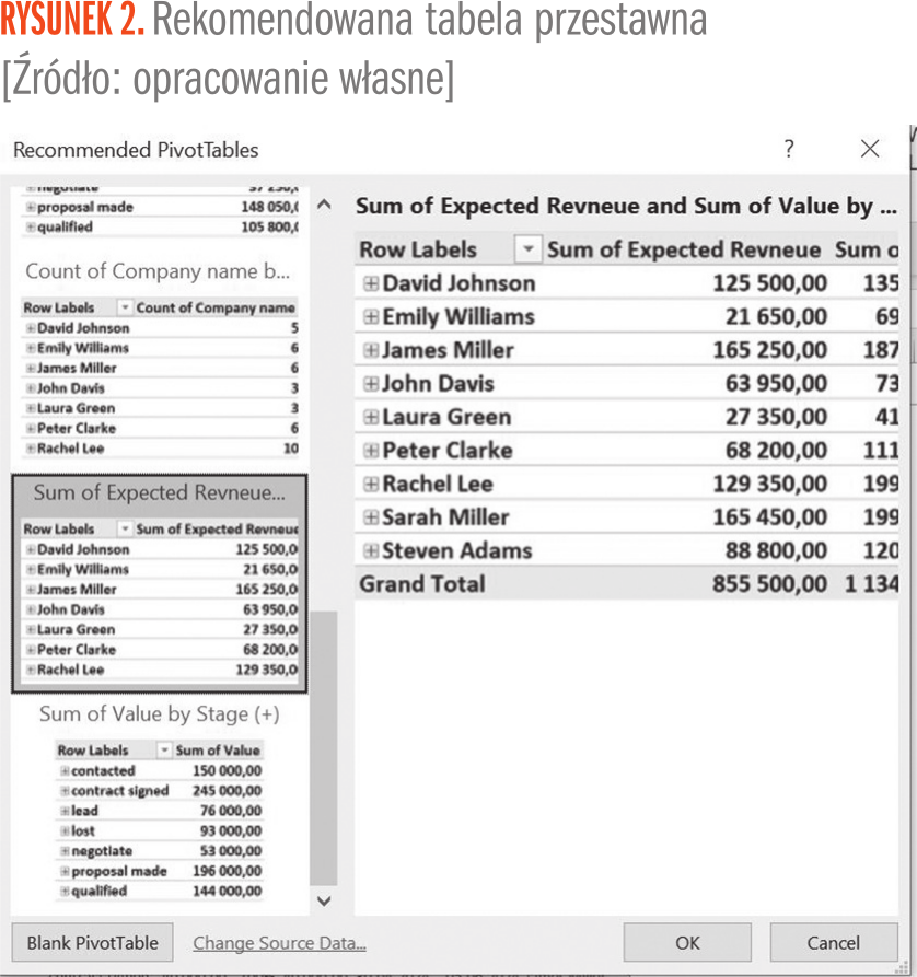 Przechodząc do rzeczy – zaznaczmy zakres danych (najlepiej używając CTRL + SHIFT + strzałka w dół oraz strzałka w prawo). Następnie przechodzimy do karty Insert -> Recommended PivotTables. Jak widać na Rysunku 2, Excel podpowiada nam kilka opcji. Wybrałem jedną z ciekawszych, która agreguje „Expected revenue per osoba”, bo taki jest mój cel. Wybieram i klikam OK.