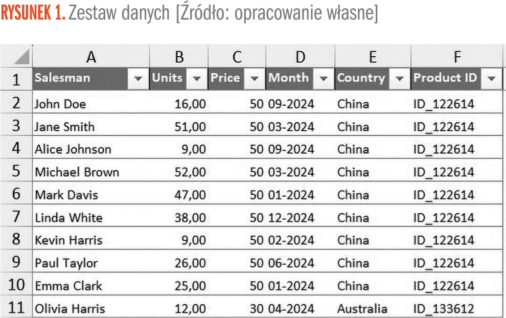 Sporo nauki przed nami, zatem bez zbędnej zwłoki zaczynamy. Nasz zestaw danych do pracy prezentuje Rysunek 1. Jest to oczywiście mały fragment tabeli. Nasz zestaw to zbiór danych sprzedażowych. Widzimy imię i nazwisko sprzedawcy, liczbę jednostek oraz cenę towaru sprzedanego, okres, w którym dany towar został sprzedany, kraj, w którym dokonano sprzedaży, oraz ID produktu.