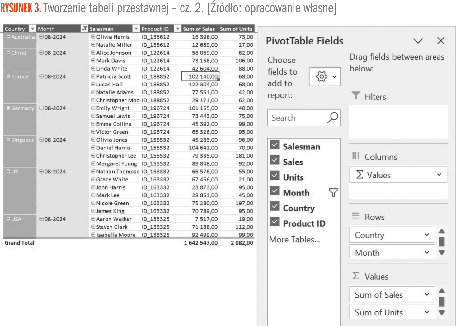 - Do wierszy przesuwamy po kolei „Country” -> „Month” -> „Salesman” -> „Product ID”.